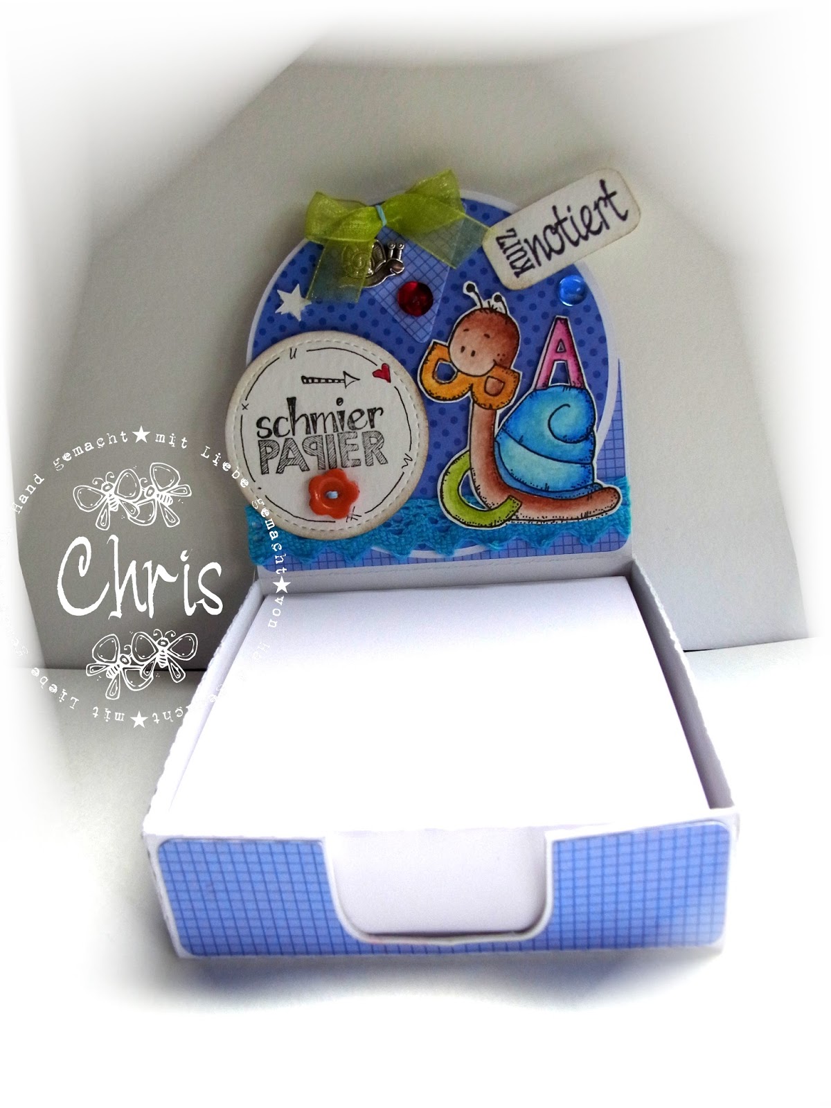 Diese kleine Zettelbox habe ich, für den Schreibtisch von meinem Enkel , gebastelt. Er ist auch so ein kleiner Bastler und braucht laufend Papierchen zum Bekritzeln oder Zerschneiden.
